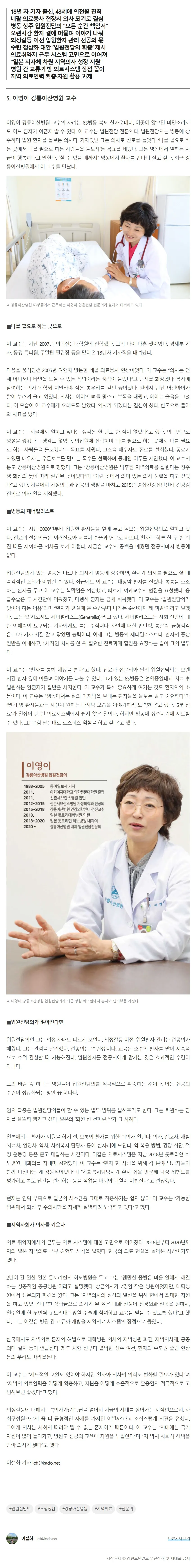 5. 이영이 강릉아산병원 교수이영이 강릉아산병원 교수의 자리는 63병동 복도 한가운데다. 이곳에 앉으면 비명소리로도 어느 환자가 아픈지 알 수 있다. 이 교수는 입원전담 전문의다. 입원전담의는 병동에 상주하며 입원 환자를 돌보는 의사다. 기자였던 그는 의사로 진로를 틀었다. ‘나를 필요로 하는 곳에서 나를 필요로 하는 사람들을 돌보자’는 목표를 세웠다. 그는 병동에서 일하는 지금이 행복하다고 말한다. “할 수 있을 때까지” 병동에서 환자를 만나며 살고 싶다. 최근 강릉아산병원에서 이 교수를 만났다.■나를 필요로 하는 곳으로이 교수는