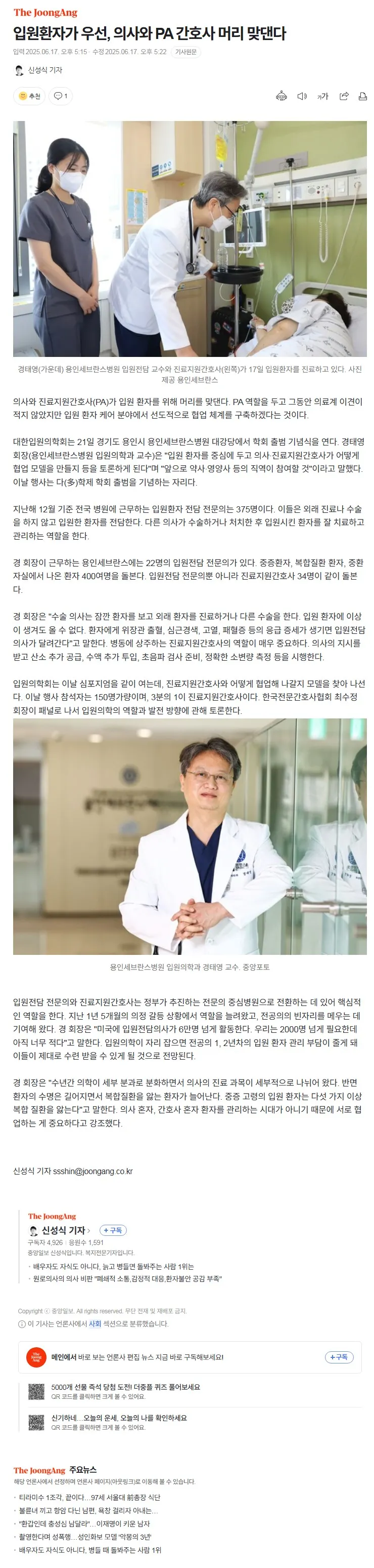 2025.06.17 [중앙일보] 입원환자가 우선, 의사와 PA 간호사 머리 맞댄다
