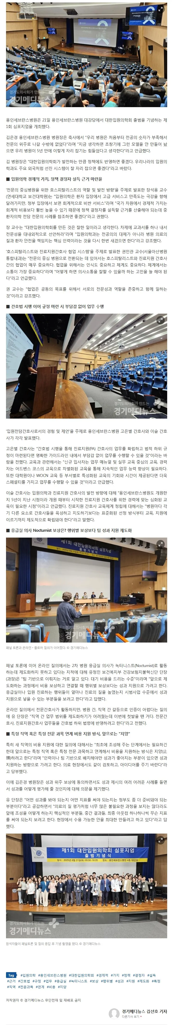 용인세브란스병원은 21일 용인세브란스병원 대강당에서 대한입원의학회 출범을 기념하는 제1회 심포지엄을 개최했다. 김은경 용인세브란스병원 병원장은 축사에서 "우리 병원은 처음부터 전공의 숫자가 부족해서 전문의 위주로 나갈 수밖에 없었다"라며 "지금 생각하면 초창기에 그런 모델을 안 만들어 놨으면 우리 병원이 5년 만에 이렇게 자리 잡기는 힘들었다고 생각한다"라고 언급했다.김 병원장은 "대한입원의학회가 발전하는 만큼 정책에도 반영하면 좋겠다. 우리나라의 입원의학과도 주요 외국처럼 선진 시스템이 잘 자리 잡으면 좋겠다"라고 바랐다.■ 입원