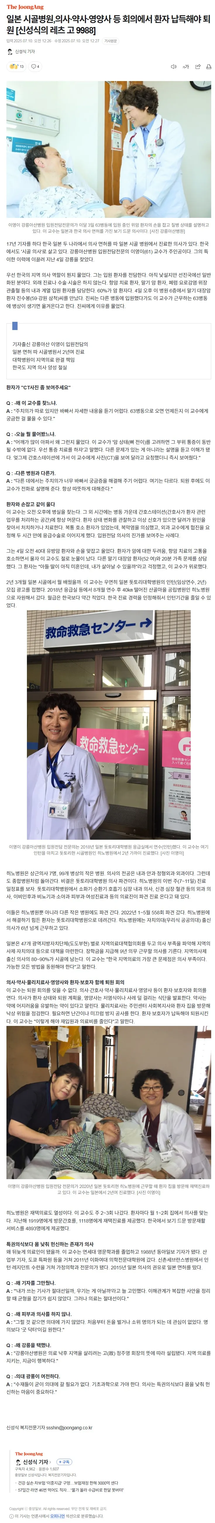 2025.07.10 [중앙일보] 일본 시골병원,의사·약사·영양사 등 회의에서 환자 납득해야 퇴원 [신성식의 레츠 고 9988]