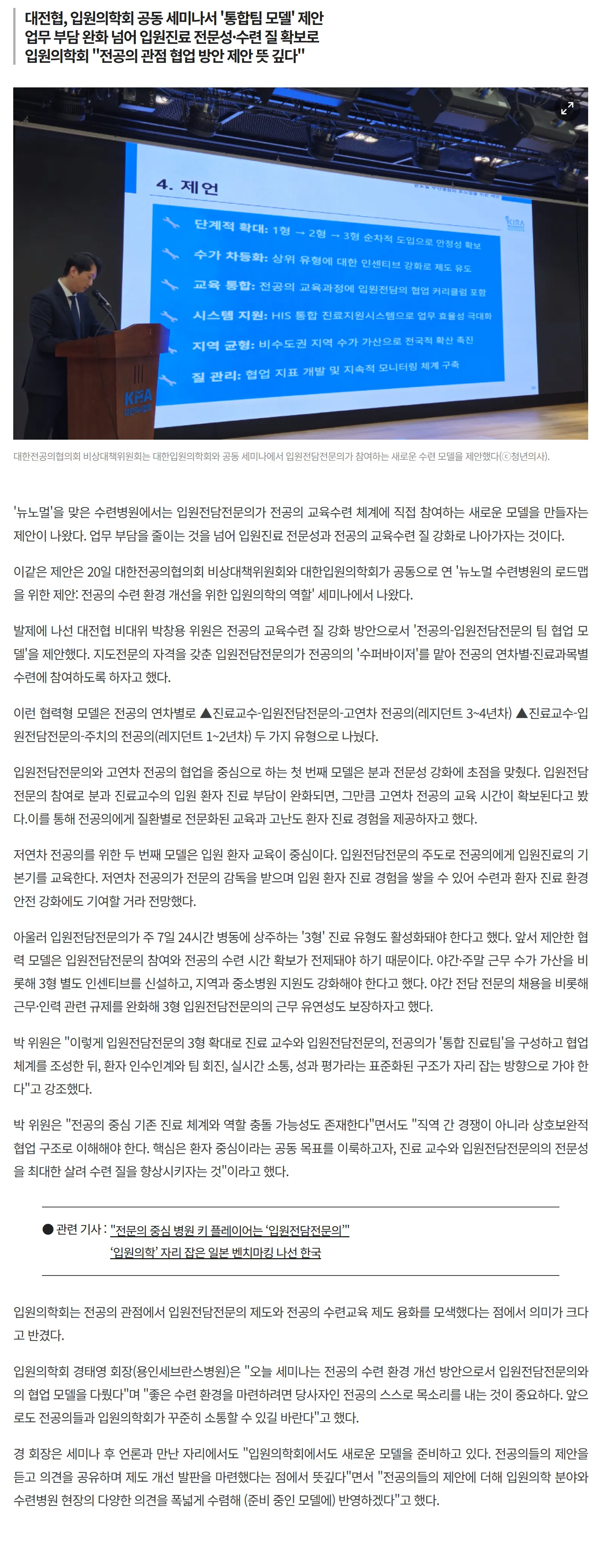 '뉴노멀'을 맞은 수련병원에서는 입원전담전문의가 전공의 교육수련 체계에 직접 참여하는 새로운 모델을 만들자는 제안이 나왔다. 업무 부담을 줄이는 것을 넘어 입원진료 전문성과 전공의 교육수련 질 강화로 나아가자는 것이다.이같은 제안은 20일 대한전공의협의회 비상대책위원회와 대한입원의학회가 공동으로 연 '뉴노멀 수련병원의 로드맵을 위한 제안: 전공의 수련 환경 개선을 위한 입원의학의 역할' 세미나에서 나왔다.발제에 나선 대전협 비대위 박창용 위원은 전공의 교육수련 질 강화 방안으로서 '전공의-입원전담전문의 팀 협업 모델'을 제안했다.