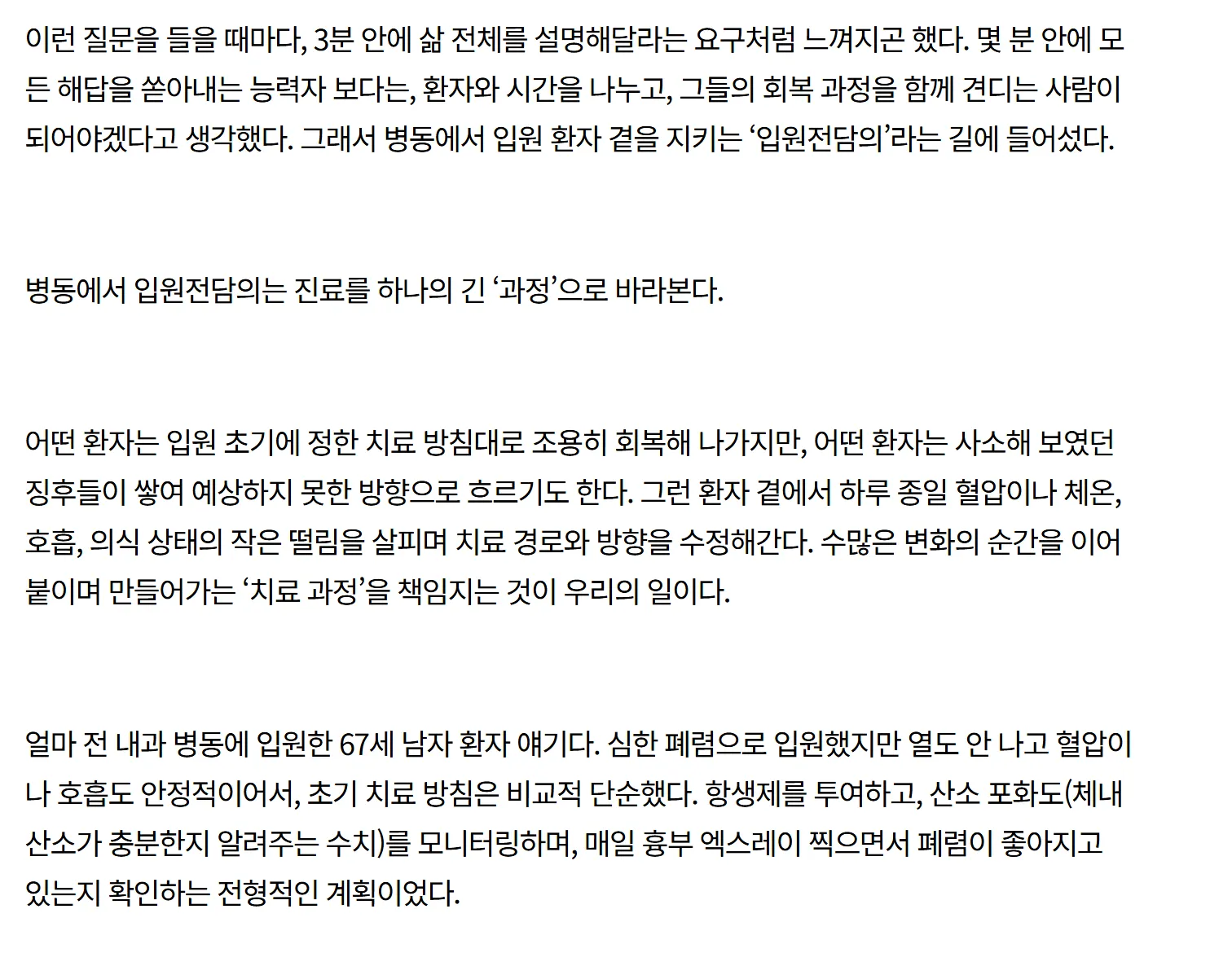 병동에서 입원전담의는 진료를 하나의 긴 ‘과정’으로 바라본다. 어떤 환자는 입원 초기에 정한 치료 방침대로 조용히 회복해 나가지만, 어떤 환자는 사소해 보였던 징후들이 쌓여 예상하지 못한 방향으로 흐르기도 한다.