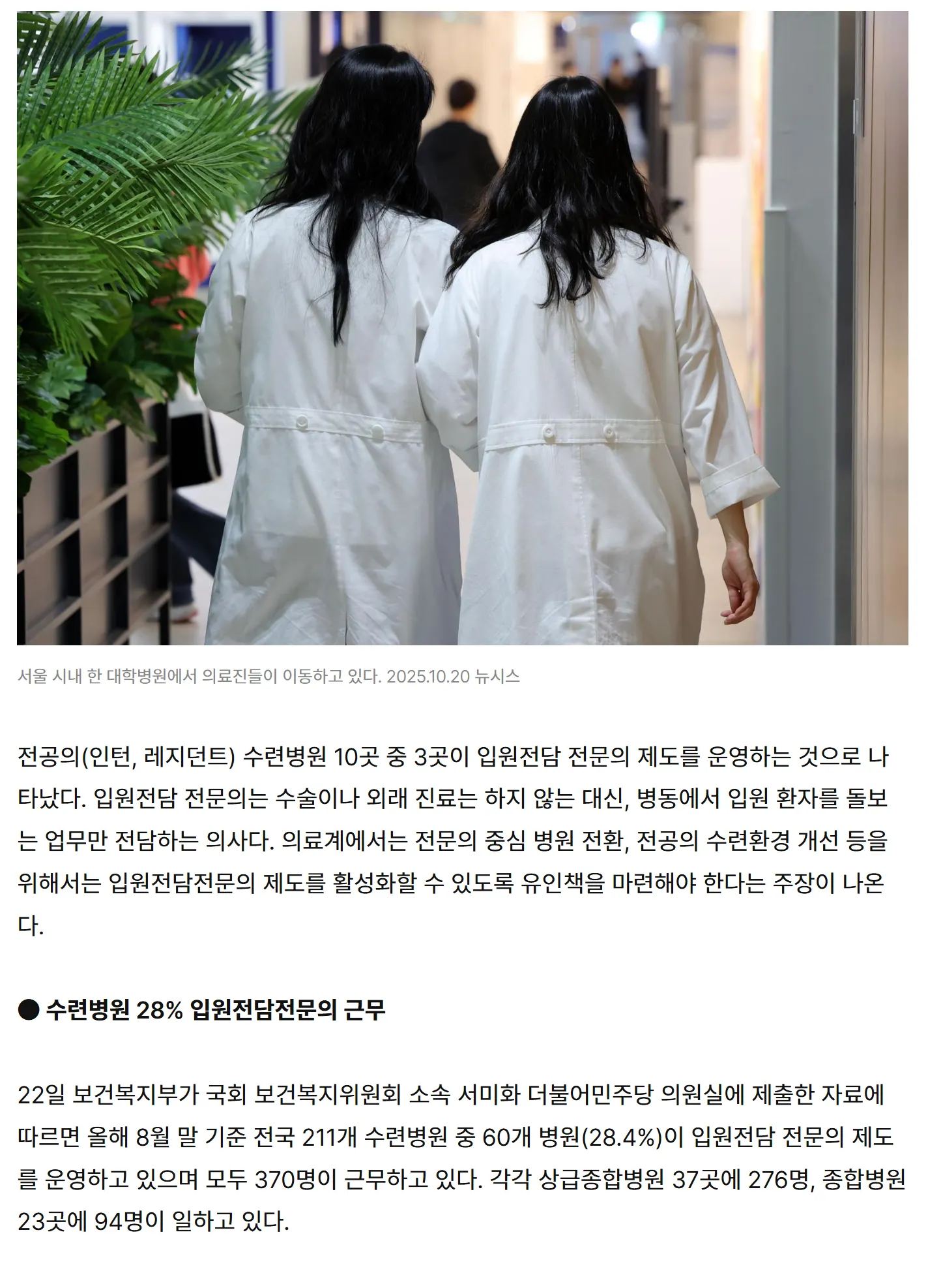 2025.10.22 [동아일보] ‘전문의 중심병원’ 추진에도 입원전담전문의 10곳 중 3곳만 운영