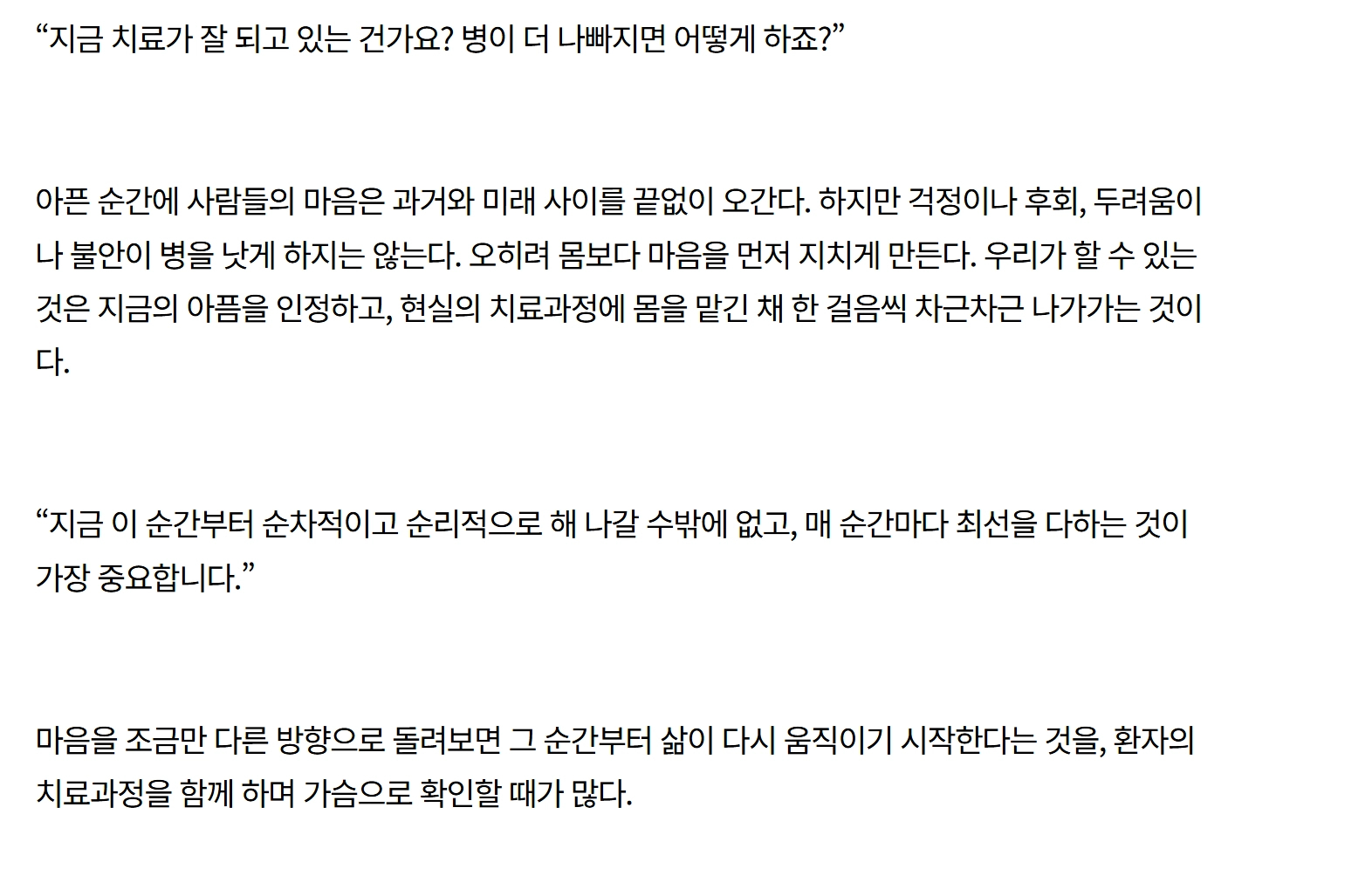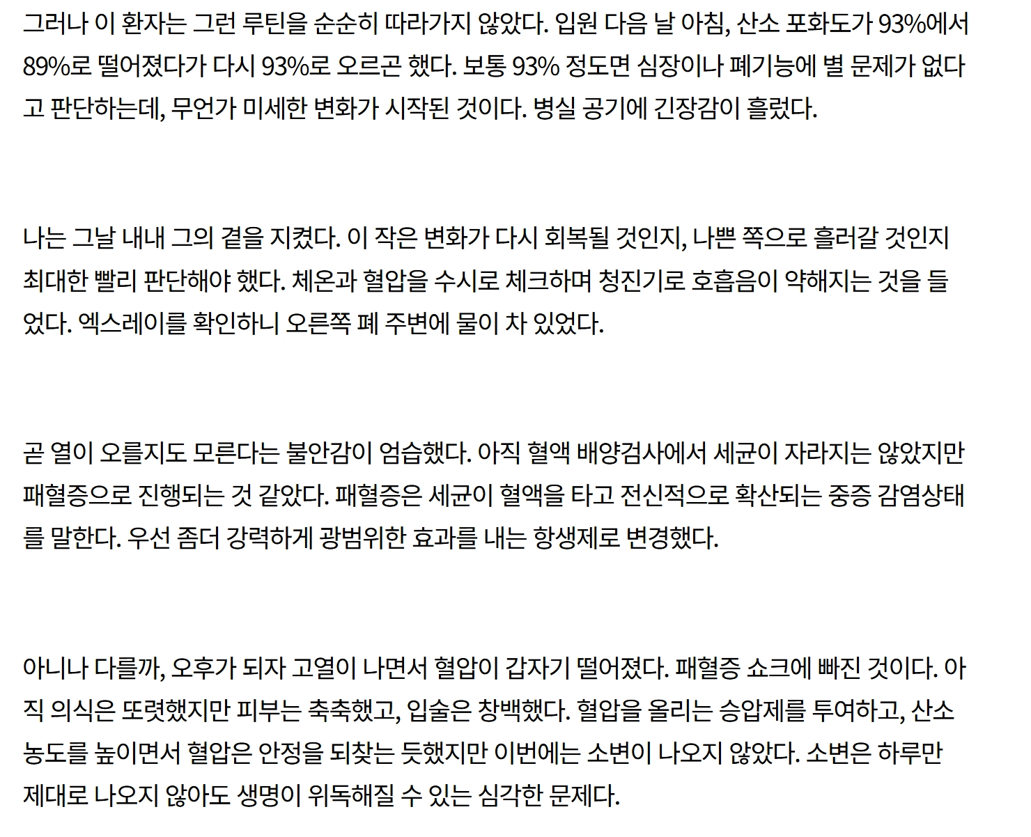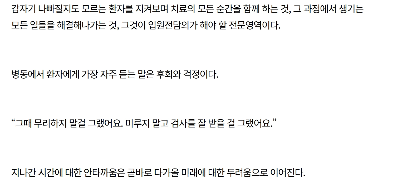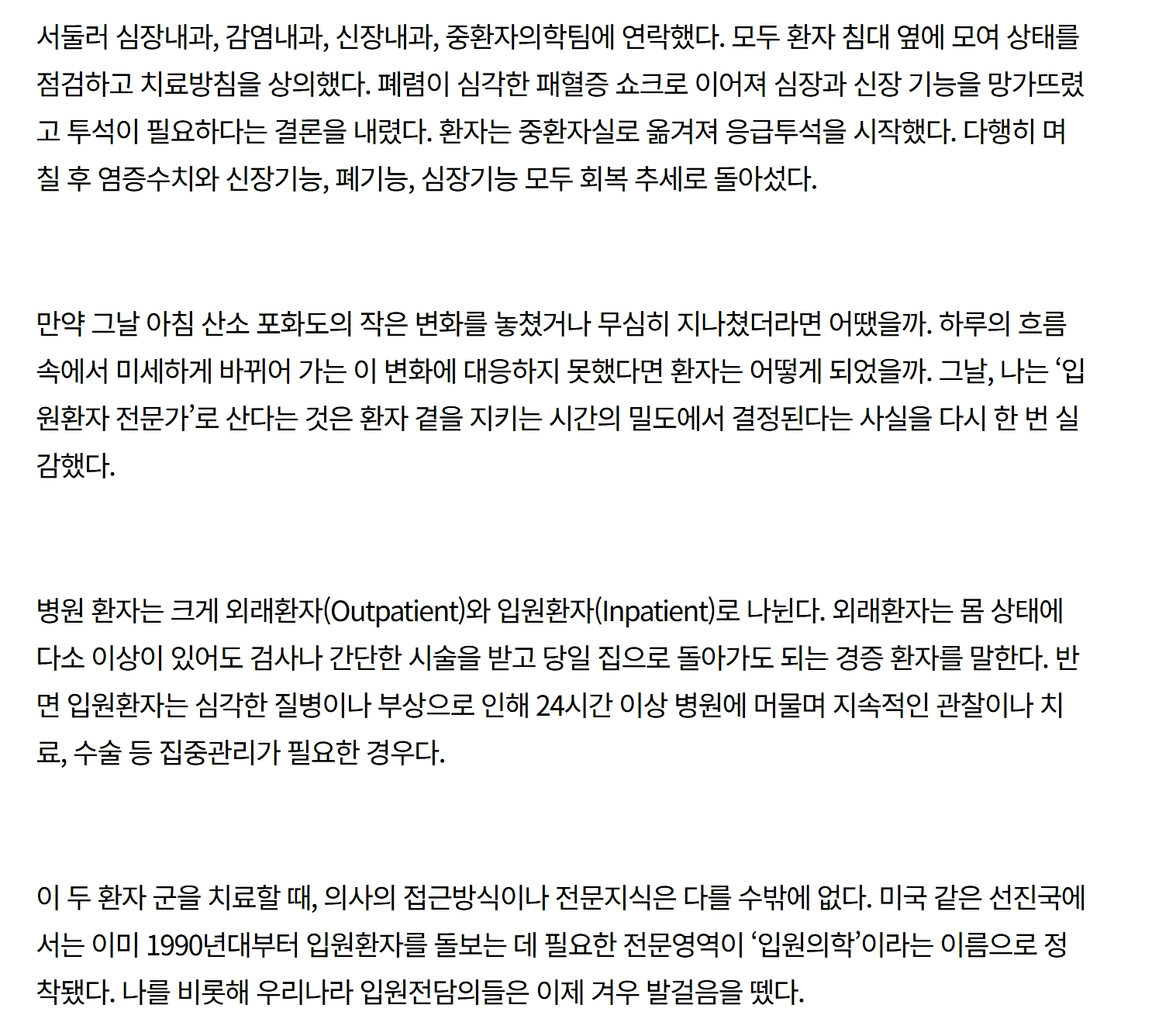 병동에서 입원전담의는 진료를 하나의 긴 ‘과정’으로 바라본다. 어떤 환자는 입원 초기에 정한 치료 방침대로 조용히 회복해 나가지만, 어떤 환자는 사소해 보였던 징후들이 쌓여 예상하지 못한 방향으로 흐르기도 한다.